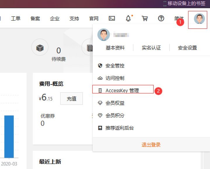 到这里购买域名和实名认证后进行AccessKey获取,点击右上角的【控制台】然后鼠标移动到右上角的头像图标那里点击下面的【AccessKey管理】