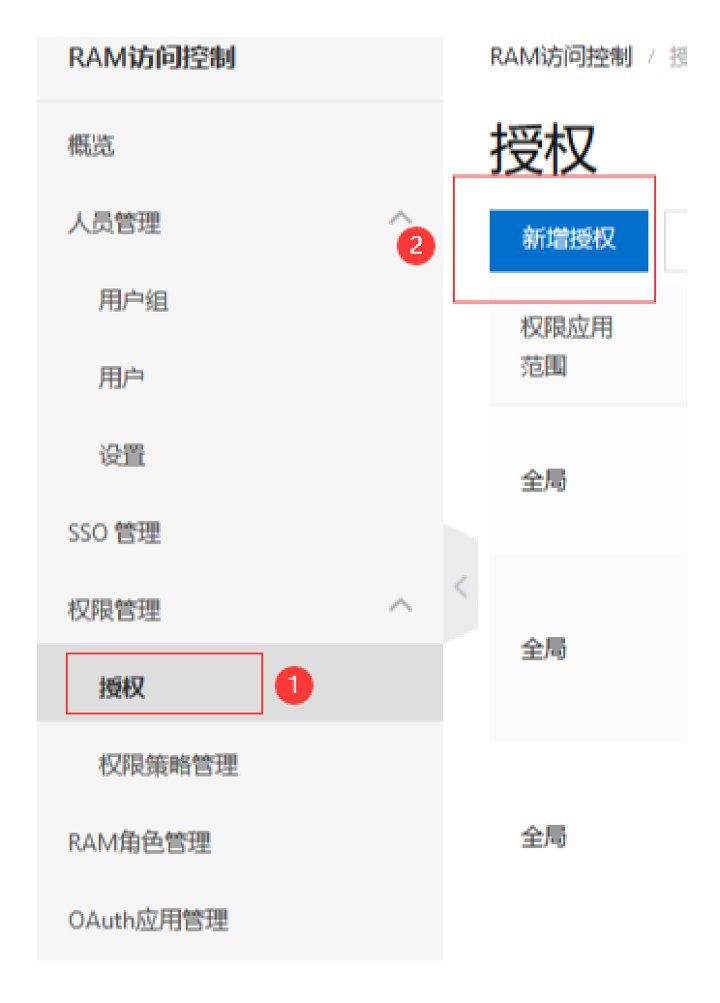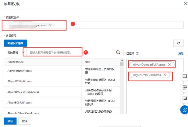 被授权主体填写刚才申请AccessKey时填写的登录名称,然后查找两个权限策略选择出来,再点击确定即可。