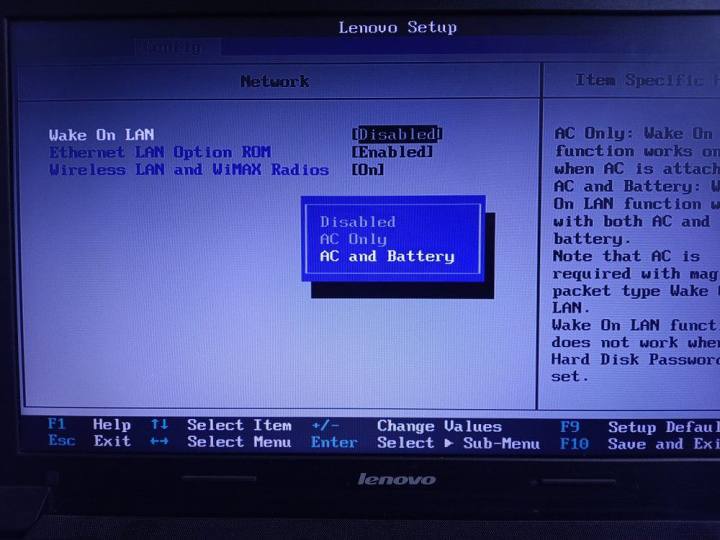 第一个功能就是网络唤醒,小框内依次是,关闭,只用电源 ,电池和电源,我们选第三就好