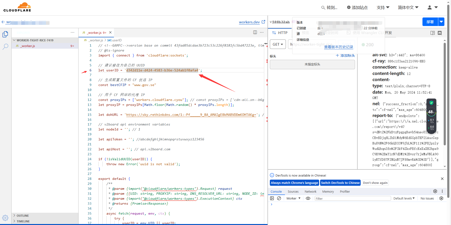 这里修改ID,不然会被别人白嫖。有类似v2ray的工具可以直接生成或者使用已有节点的ID,或者去https://www.uuidgenerator.net/ 生成。修改后点击右上角的【部署】即可完成全部步骤。