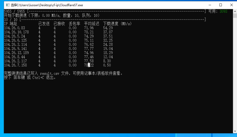 打开 CloudflareST.exe 等待测试完成即可得到体验最好的ip,注意,该测试需要消耗流量,网速越快消耗越多。